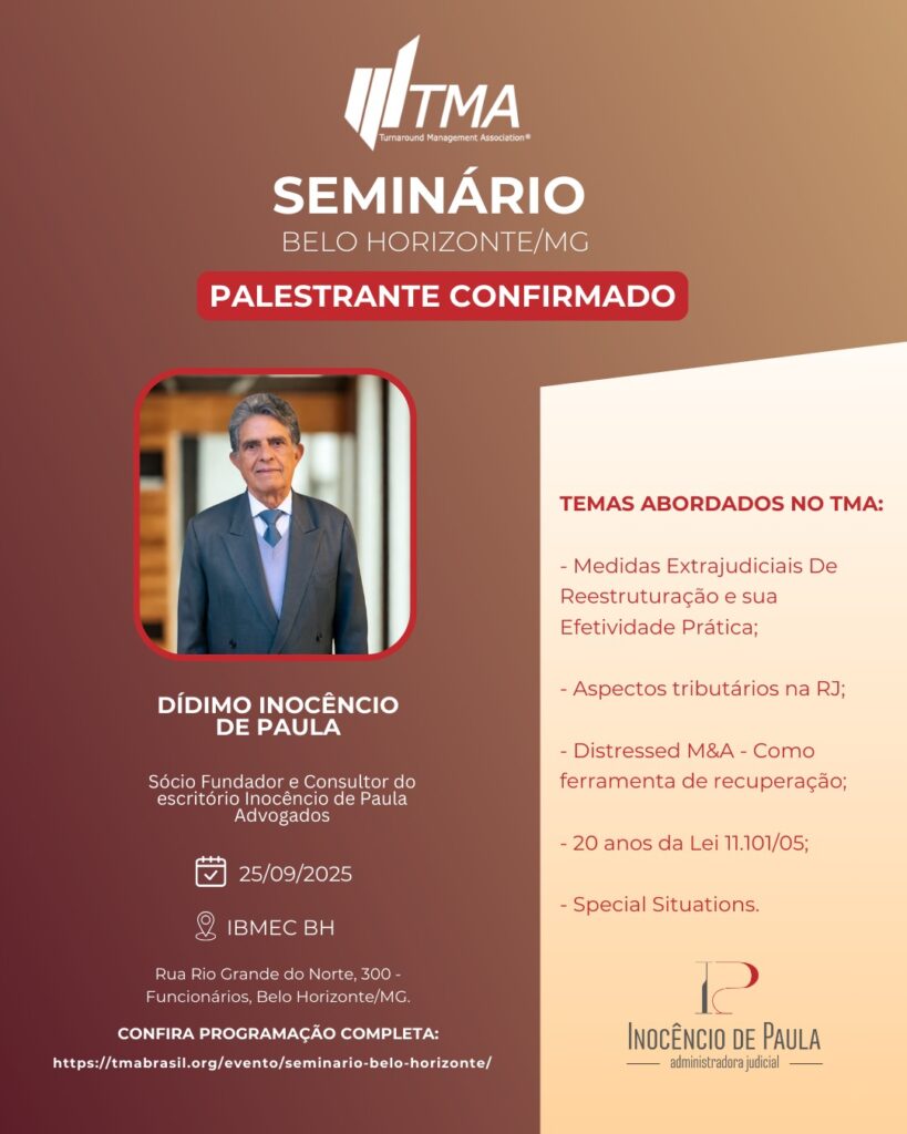 Temos a satisfação de anunciar que o Dr. Dídimo Inocêncio de Paula, sócio fundador do Inocêncio de Paula Advogados, será palestrante no 07º Seminário em Belo Horizonte/MG promovido pela TMA Brasil, no dia 25 de setembro, no IBMEC BH. O encontro reunirá os principais profissionais da área para debater grandes temas da reestruturação e recuperação […]