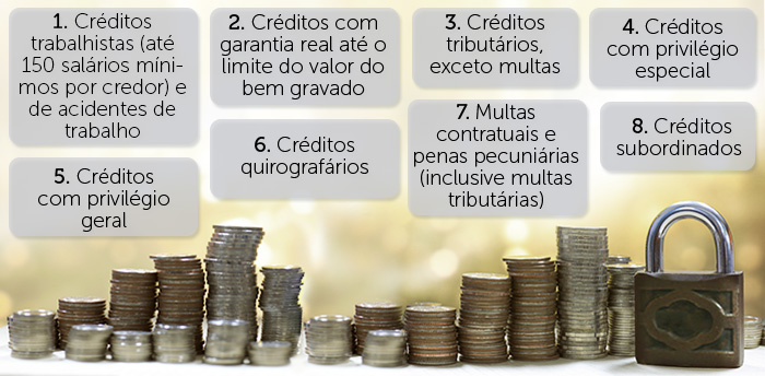 A ordem de recebimento dos créditos está disposta desta forma no artigo 83 da Lei de Recuperação e Falência – LRF (Lei 11.101/2005):