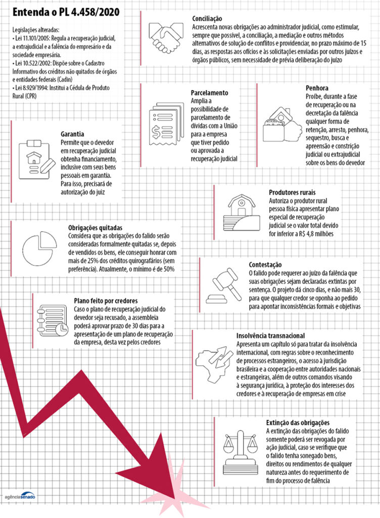 A proposição estende prazos para pagamento de dívidas tributárias e trata da concessão de empréstimos e suspensão de penhora durante a recuperação da empresa; de negociações preventivas entre credores e devedores e até da cooperação entre as Justiças nacional e estrangeira em casos de insolvência transnacional, além de regular outros temas específicos.
